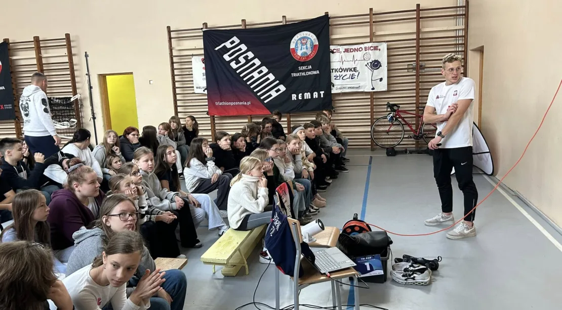 W wydarzeniu wzięło udział ponad 80 uczniów, którzy najpierw wysłuchali ciekawego wykładu, a potem mieli okazję poczuć się jak prawdziwi triathloniści – wskoczyli w buty zawodników i spróbowali swoich sił w mini zawodach! 🏊🚴🏃♀️